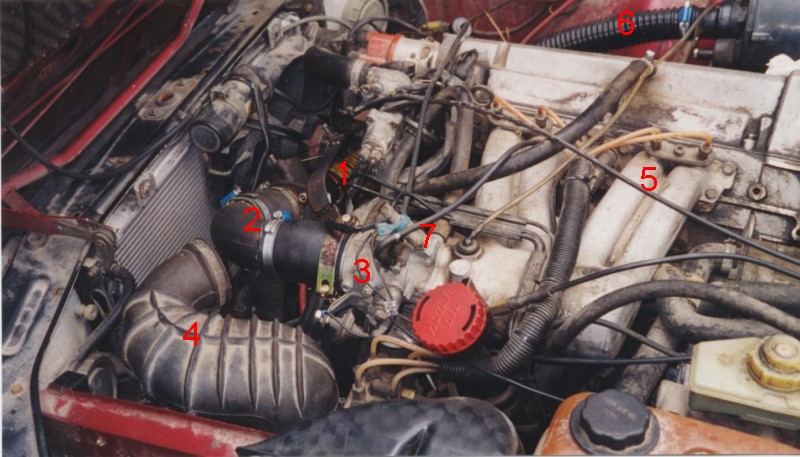 Saabin konehuone kaasulla ajettaessa. (1) raakakaasun tuloputki. Putki kulkee auton alla. (2) kaasun sekoitin ja irrotettava väliputki. (3) määränsäätöläpän kotelo. Käytetään kuten bensalla ajettaessa kierrosluvun säätöön. (4) ilmamäärämittarille/ruiskutuslaitteistolle menevä imuputki. Ruiskutuslaitteisto ei ole käytössä kaasulla ajettaessa. (5) toisioilman säätövaijeri ohjaamosta sekoittimelle. (6) toisioilmaputki, tulee erilliseltä ilmansuodattimelta. (7) kylmäkäynnistyssuutin, jolla voidaan antaa käynnistysapua. Suutin kuuluu Saabin vakiovarustukseen, sille on asennettu erillinen käyttökytkin ohjaamoon.